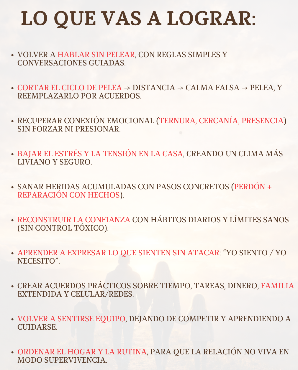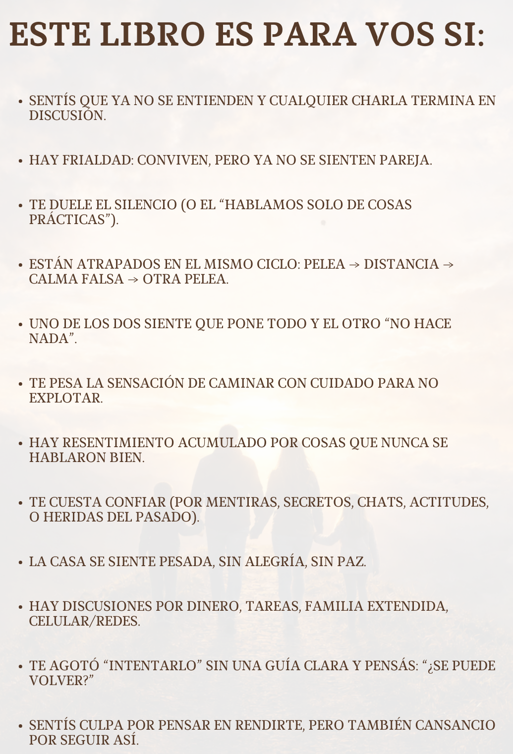 No. Este ebook es para parejas que quieren mejorar la relación, volver a conectarse, sanar heridas y traer paz al hogar, incluso si todavía no están en una crisis muy grande.