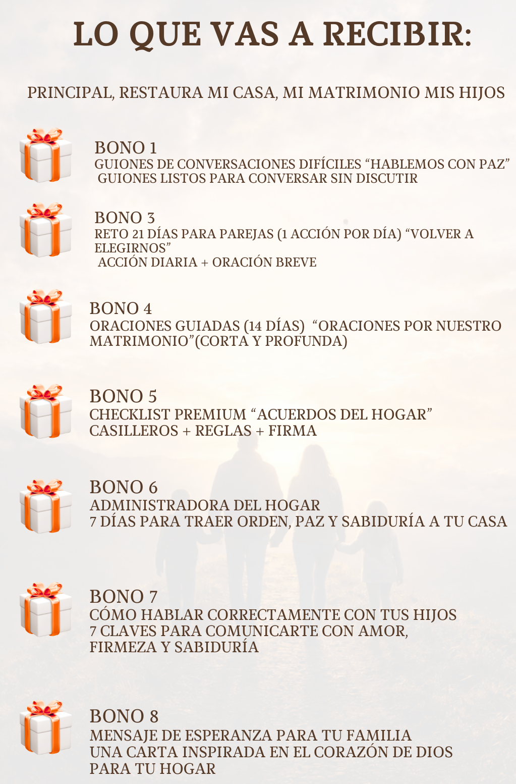 Vas a recibir el ebook digital “Restaura Mi Casa” y los 5 bonos de regalo. Todo se envía de forma online para que lo puedas descargar y ver desde tu celular, tablet o computadora.